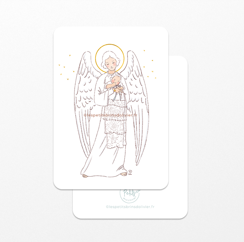 Image signet souvenir de baptême Ange Gardien – Avec un bébé en robe ancienne et petit béguin en dentelle, inscriptible au verso, format A7. © Illustration Isabelle Monnerot-Dumaine – Les Petits Brins d’Olivier. Imprimés en France.