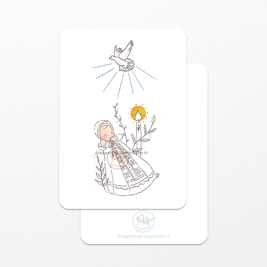 Image signet souvenir de baptême Bébé en robe de baptême, cierge et colombe, inscriptible au verso et personnalisable, format A7. © Illustration Isabelle Monnerot-Dumaine – Les Petits Brins d’Olivier. Imprimés en France.