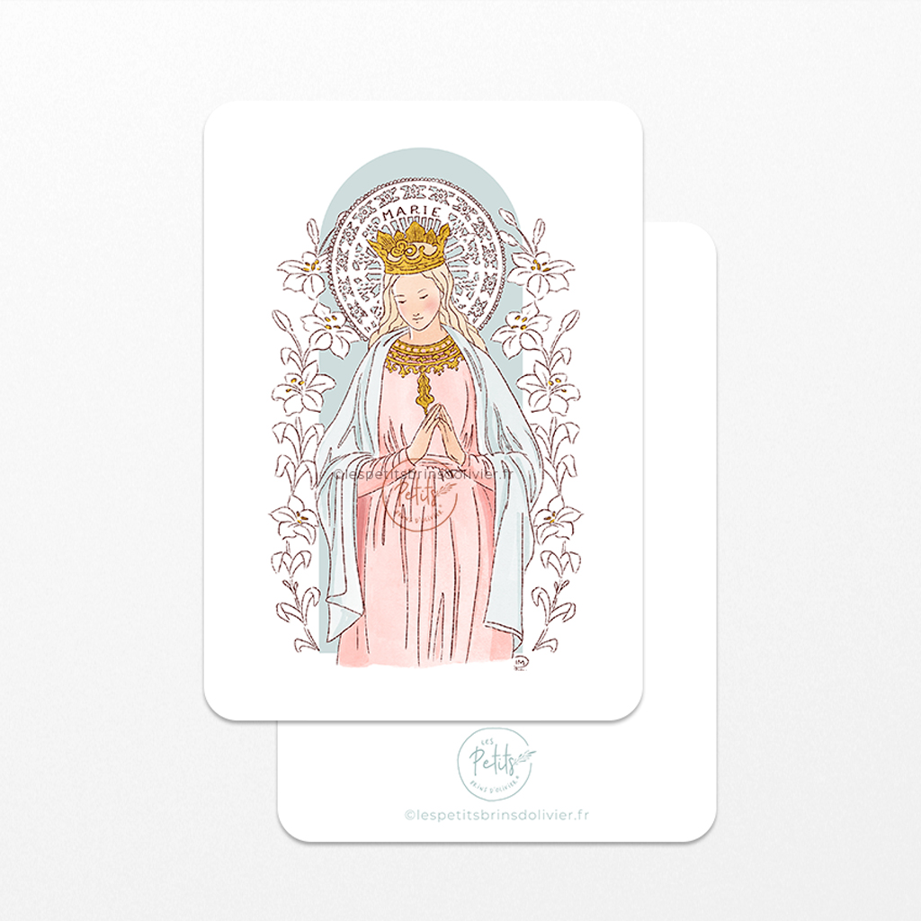 Sainte Vierge Marie au lys et canivet, image signet de baptême, inscriptible ou personnalisable au verso, format A7 © Les Petits Brins d’Olivier – Isabelle Monnerot-Dumaine.