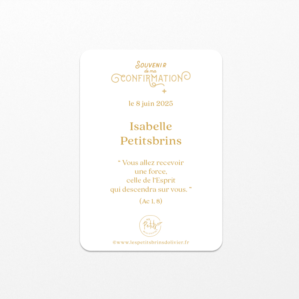 7 dons du Saint-Esprit finition dorure, Image signet de Confirmation, verso inscriptible ou personnalisable.