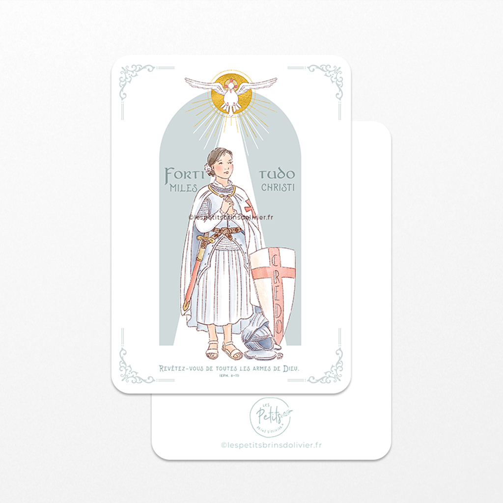 Image signet de confirmation « Fortitudo Miles Christi » version fille couleur bleue, représentant une jeune confirmante recevant l’effusion de l’Esprit-Saint lors de sa confirmation. L’Esprit-Saint est représenté par un paraclet au-dessus d’elle. La citation « Fortitudo miles Christi » (Courage, soldat du Christ) illustre parfaitement bien le verset de la lettre de saint Paul aux Ephésiens 6-11. Signet à personnaliser, format A7 – © Illustration originale Isabelle Monnerot-Dumaine – Les Petits Brins d’Olivier. Impression professionnelle à la demande, en France.