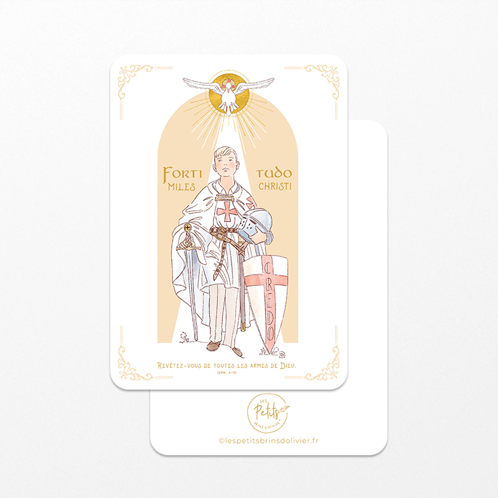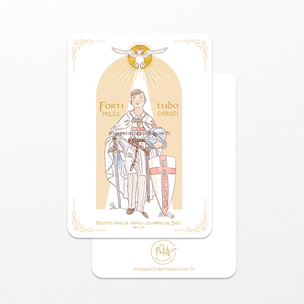Image signet de confirmation « Fortitudo Miles Christi » version Garçon, représentant un jeune confirmant recevant l’effusion de l’Esprit-Saint lors de sa confirmation. L’Esprit-Saint est représenté par un paraclet au-dessus de lui. La citation « Fortitudo miles Christi » (Courage, soldat du Christ) illustre parfaitement bien le verset de la lettre de saint Paul aux Ephésiens 6-11. Signet à personnaliser, format A7 – © Illustration originale Isabelle Monnerot-Dumaine – Les Petits Brins d’Olivier. Impression professionnelle à la demande, en France.