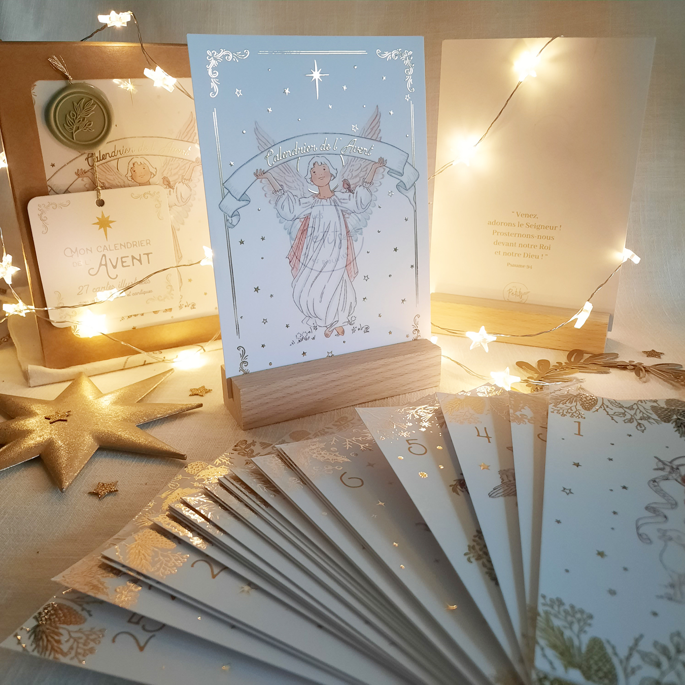 • 24 cartes illustrées finition dorure et numérotées pour chaque jour du mois de décembre, au dos desquelles un verset biblique, une prière ou un cantique de Noël vous aideront à prier.