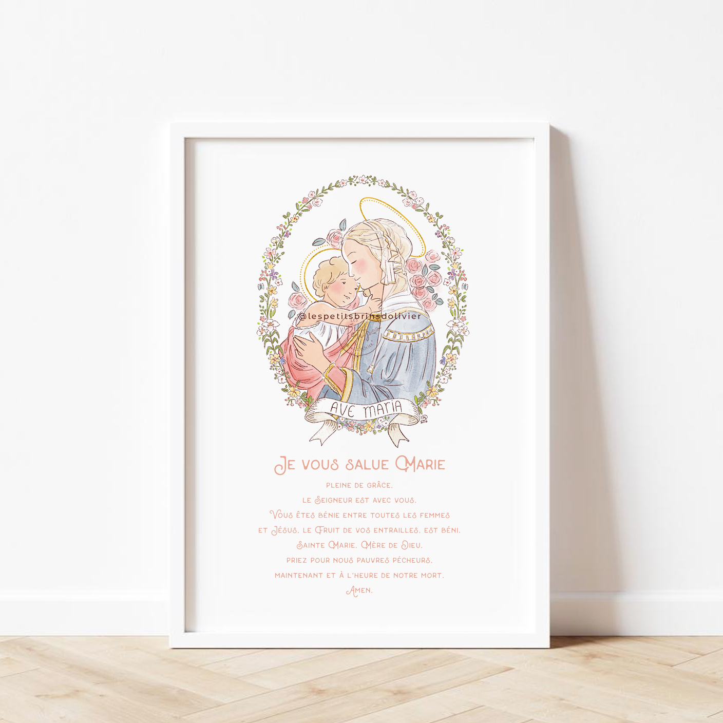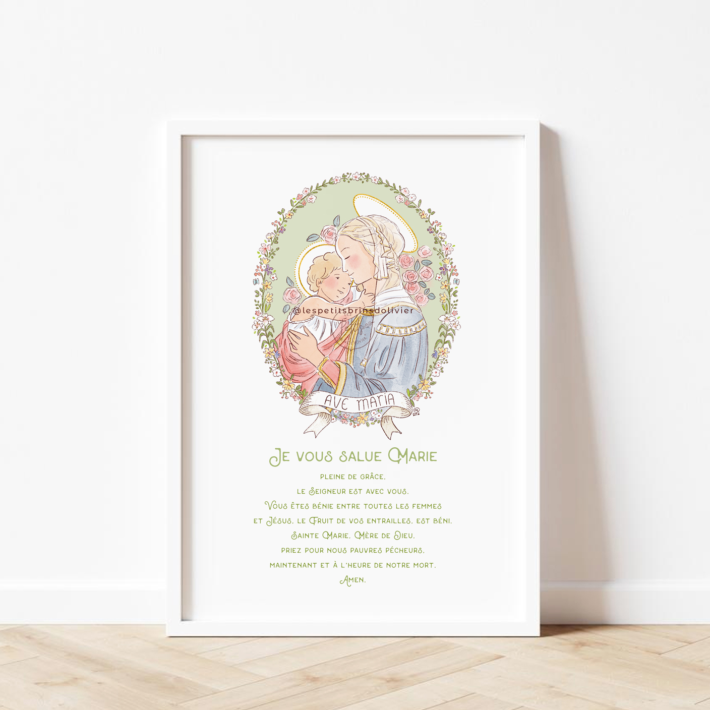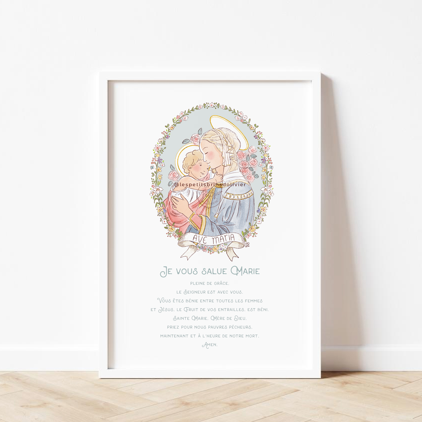Je vous salue Marie affiche prière illustrée. Sainte Vierge illustrée d’après la Vierge à l’Enfant de Sandro Botticelli (1445 – 1510) dans un médaillon fleuri. Cette illustration pleine de douceur et de tendresse, soulignée par la fraîcheur des fleurs, ornera joliment votre coin prière. Je vous salue Marie, affiche prière au Format A4 et A3, aquarelle numérique, disponible en 4 couleurs (nude, bleu glacier, blanche et vert tilleul) – © Illustration Isabelle Monnerot-Dumaine – Les Petits Brins d’Olivier. Bientôt disponible en Grande carte prière, carte prière et également en latin (Ave Maria). Impression professionnelle à la demande, en France.